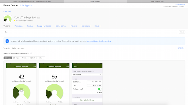 Version 1.0.0 of “Count The Days Left” is now waiting for review in the app store. Hurrah!